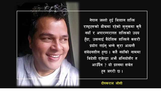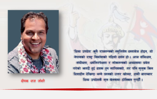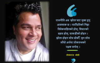 Deepak Joshi ( दीपक राज जोशी ) is a Telecommunication Engineer by Profession. Currently, He is the Managing Director of New Millennium College. He is a vegan & practices Minimalism. He writes columns for spotlight biweekly English magazine and runs the first vegan online news portal ( https://vegannepal.com.np). He travels around the country and gives lectures on Veganism and ethical living.